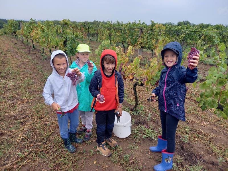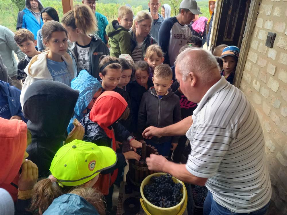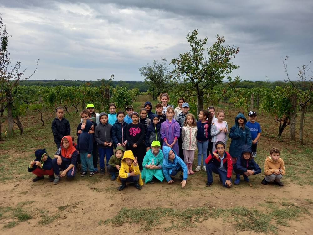 Az egyik legfontosabb őszi munkák közé tartozik a szüret. Egy hagyományos szüreten vett részt a 2. b osztály. A péteri szőlőhegyre mentünk, ahol Czeglédy Gyula nagy szeretettel várt minket. Készült nekünk zsíros kenyérrel, zöldségekkel és szörppel. Megérkezésünk után a gyerekek és felnőttek metszőollót ragadtak és mehetett is a szüret. Még az eső csepergése sem tántorított el minket a „feladattól”. A gyerekek nagyon élvezték, és mivel nagyon lelkesek voltak, a kipróbálhatták a szőlőpréselést is. Mindenki ott akart lenni, mindenki munkálkodni szeretett volna, munkájuk eredményét, a mustot pedig büszkén kóstolták meg. Nagyon kellemes délutánt töltöttünk el a szülőkkel együtt a péteri szőlőhegyen.