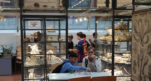 Ezek után átmentünk egy másik épületbe, ahol megnéztünk egy múzeumot az élet kialakulásáról. Ez volt a biológia tanszék Biológiai és Paleontológiai Gyűjteménye. Ennél a résznél az első egysejtűektől a telepes testfelépítésű szivacsokon át a valódi szövetekkel rendelkező állattörzseken át fedezhettük fel az evolúció állomásait egészen a ma élő emberig. Itt láttunk egy különleges folyadékban (formalinban) tárolva elhunyt élőlényeket, illetve szerveket pl: kutya kölyköket, szétboncolt vemhes patkányt, emberi agyat, rókaszívet valamint csontvázakat, kitömött állatokat is megszemlélhettünk.