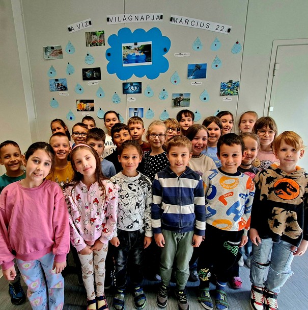 Idén sem volt ez másképp. A 2.a osztályos tanulók megismerkedtek a víz létfontosságú szerepével, a környezetszennyezés, azon belül is a vizeink szennyezésének veszélyeivel és következményeivel, valamint azzal, hogy mit tehetnek ők azért, hogy védjék vizeinket. Összeszedték az élet azon területeit, ahol elengedhetetlen a víz használata és egy-egy vízcseppre ráírták, hogy szerintük az ő életüknek melyik területéről hiányozna a legjobban a víz – az ivás után. A gondolatébresztő témában sok vélemény született. Rajzoltak, írtak, alkottak és a végén büszkén álltak a folyosót díszítő munkájuk alá.