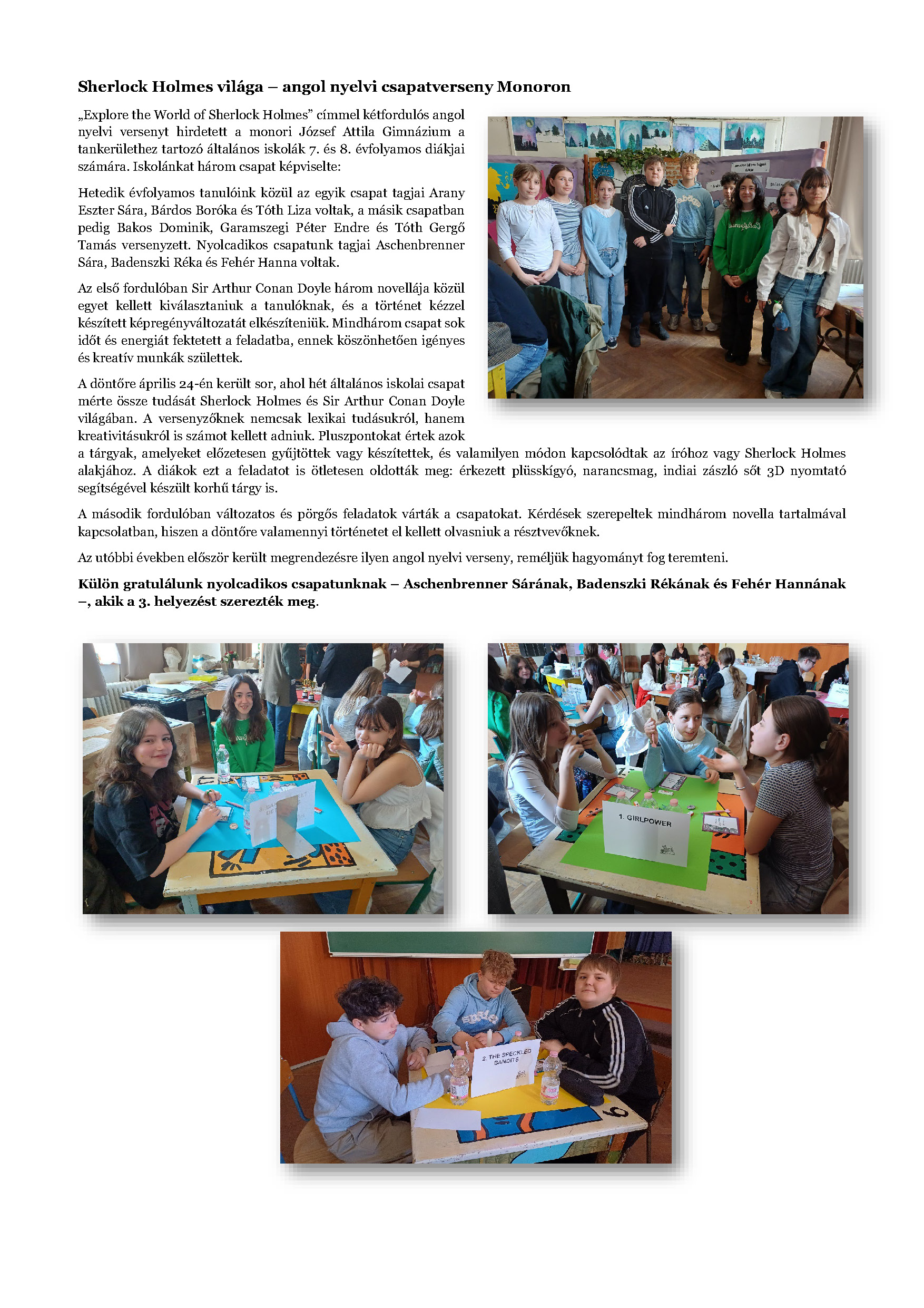 Sherlock Holmes világa – angol nyelvi csapatverseny Monoron